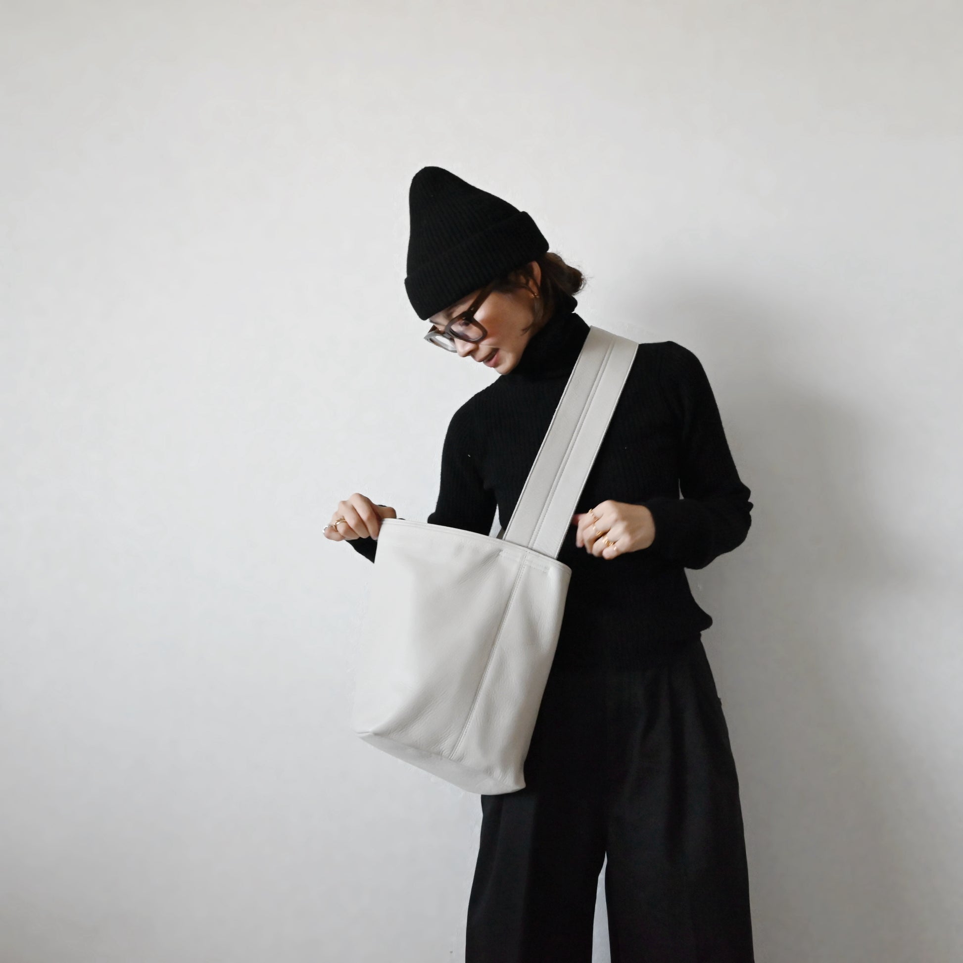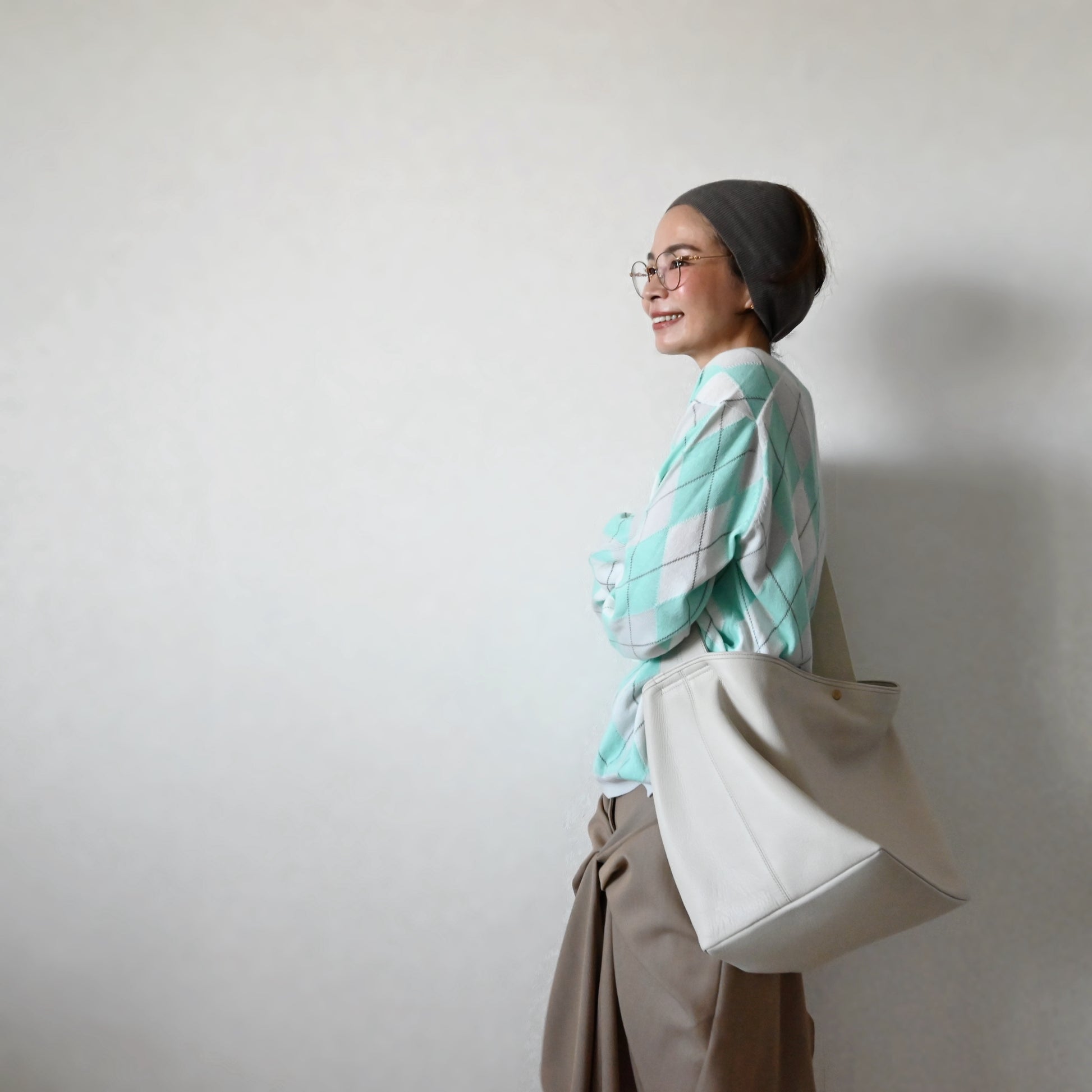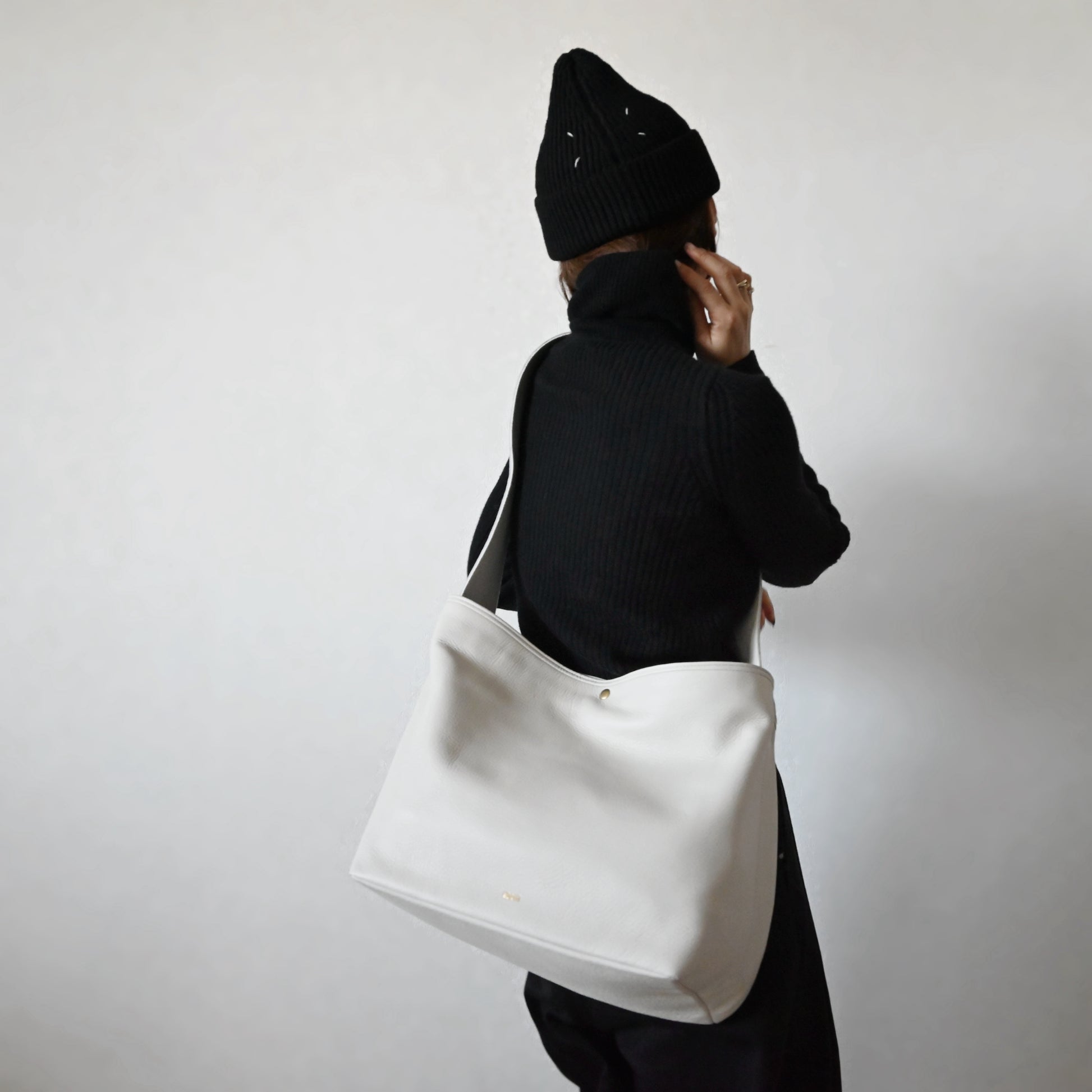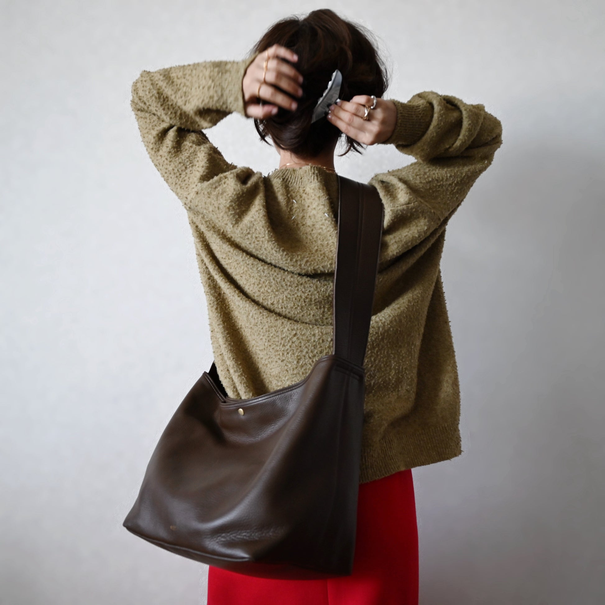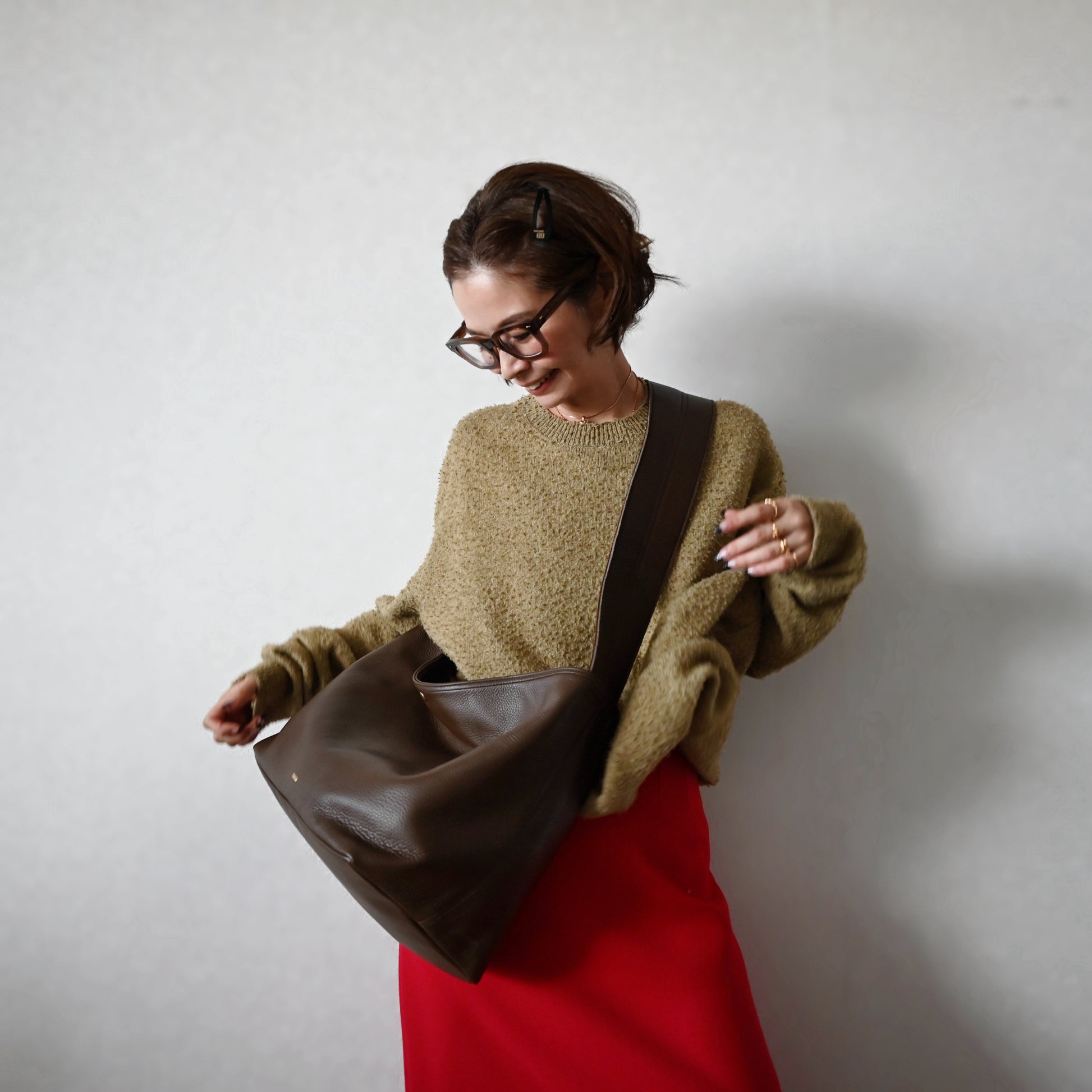 しなやかでやや光沢のあるレザーは、大きなサイズでも無骨にならず女性らしい雰囲気に。持った時のくたっとした陰影も魅力です。