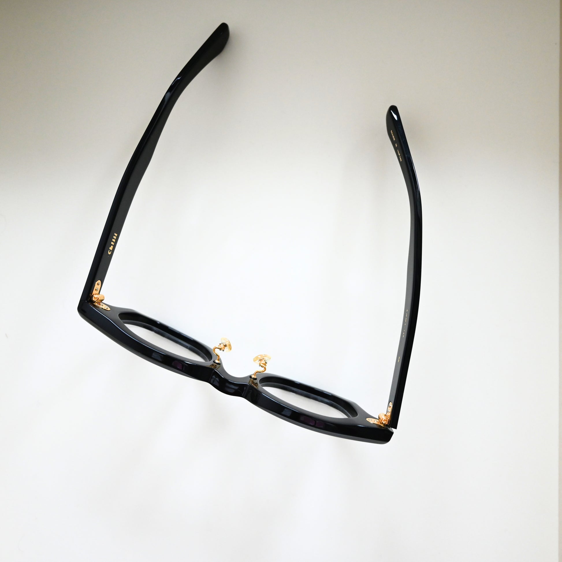 フロントとテンプルを繋ぐヒンジのカシメには10金を使用し、ノーズパッド金具や刻印もゴールドで統一。細部まで美しく、上品な印象です。