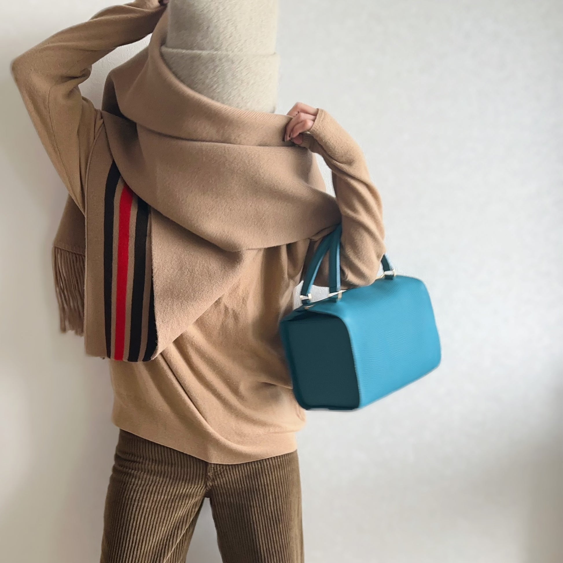 今回は上品で合わせやすいトープ、色々な場面で大活躍するブラック、他にはない落ち着いたブルー、カジュアルとモードどちらにもぴったりのキャメルの4色展開になります。