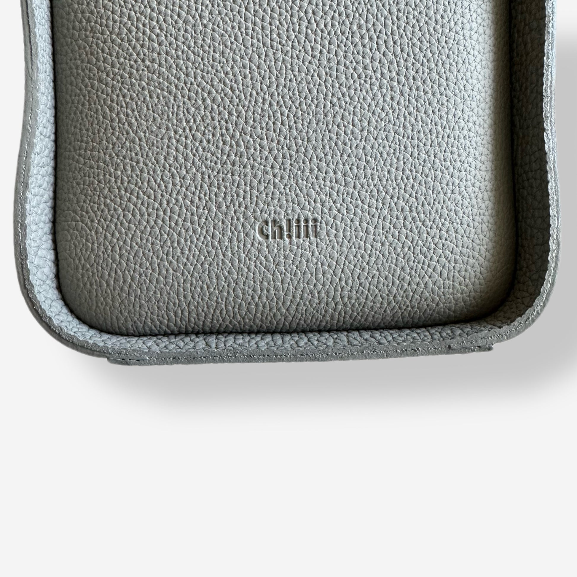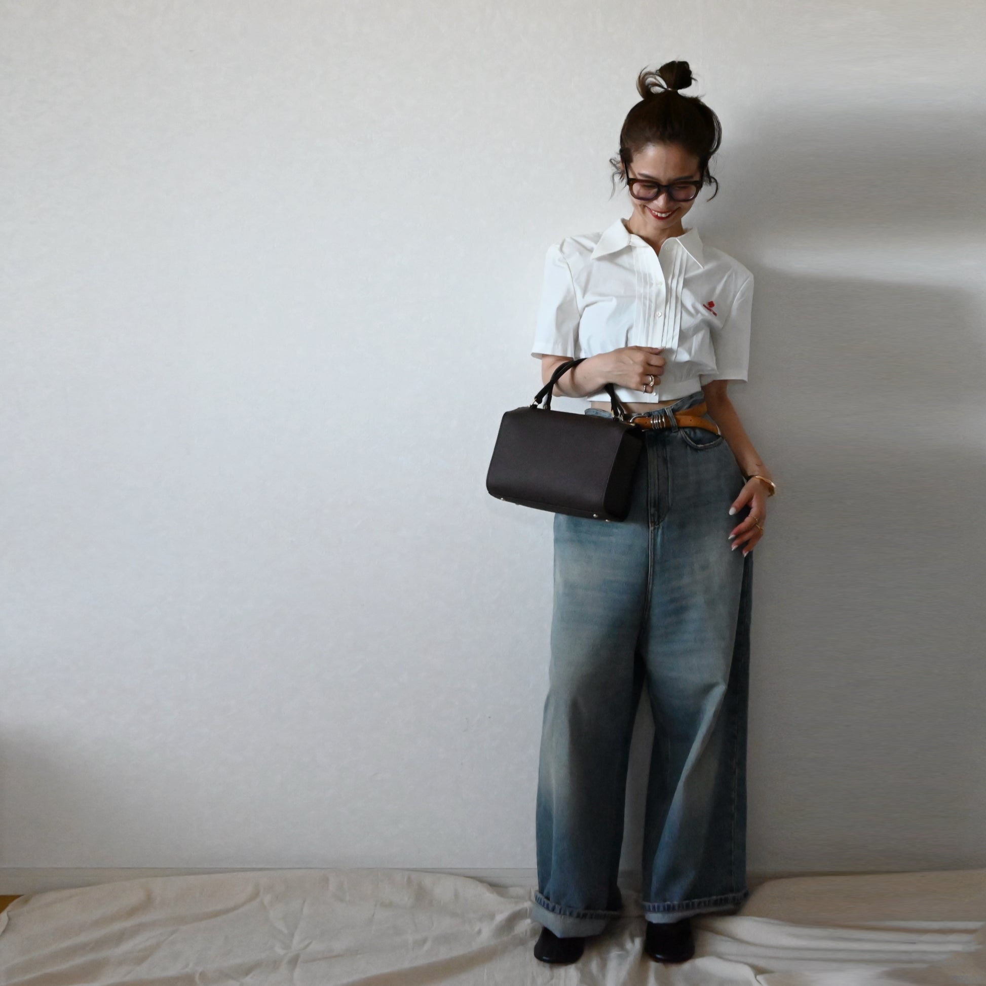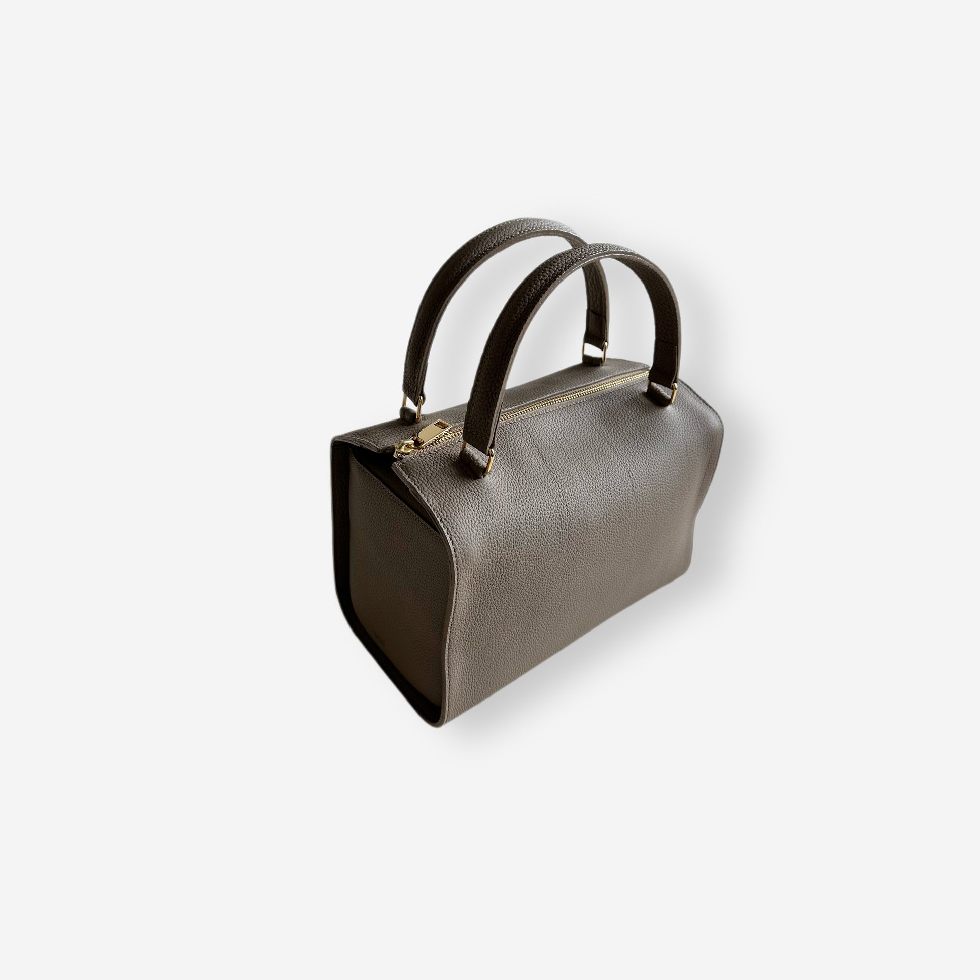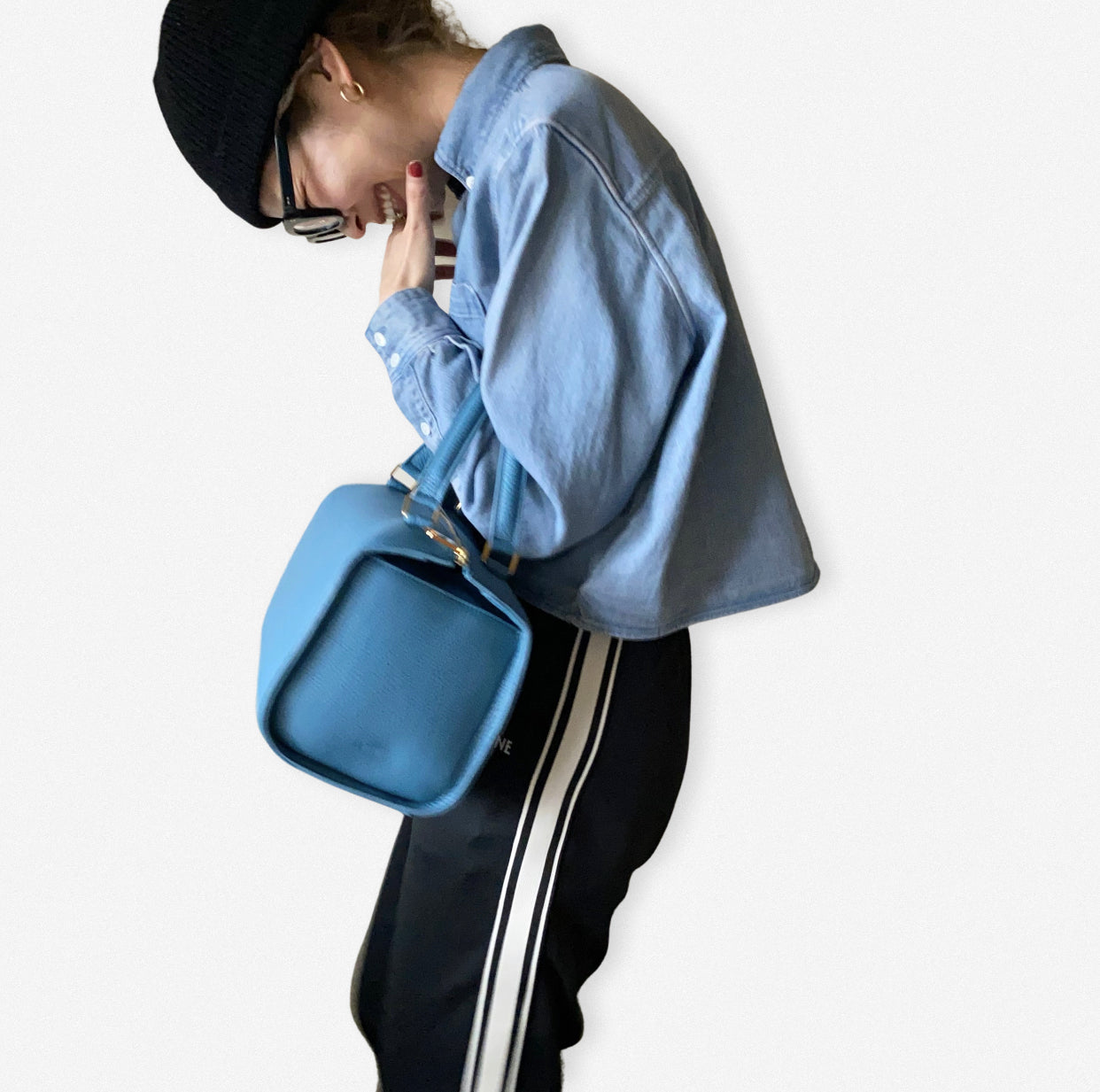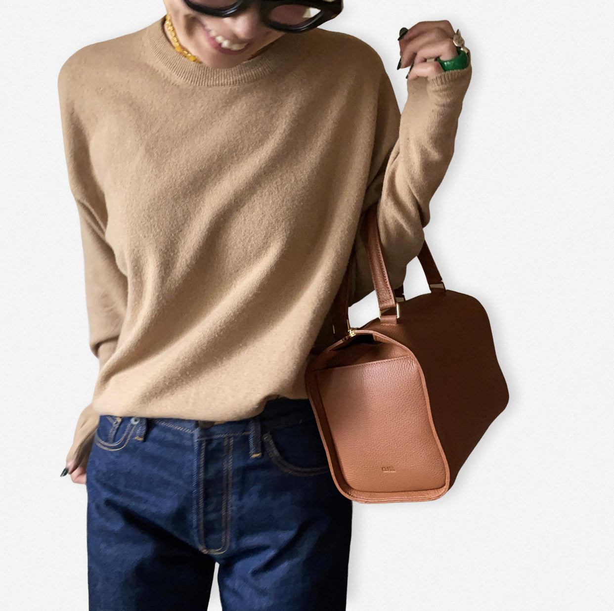 直線的なスクエア型の小さめなフォルム、余計なものを削ぎ落としたデザインでありながら広いマチは収納力もしっかりございます。いつも持ち歩くものが気持ちよく収まるサイズ。