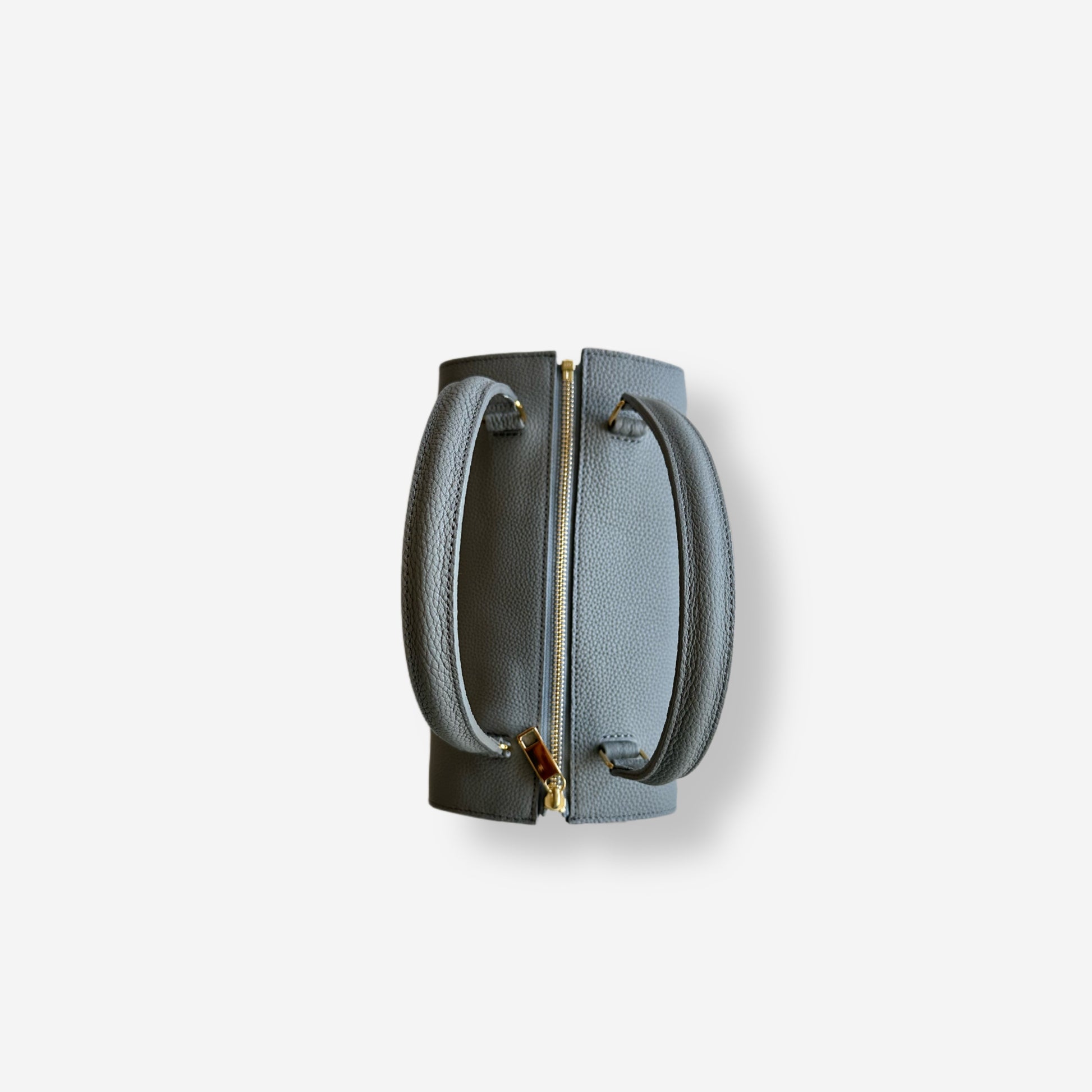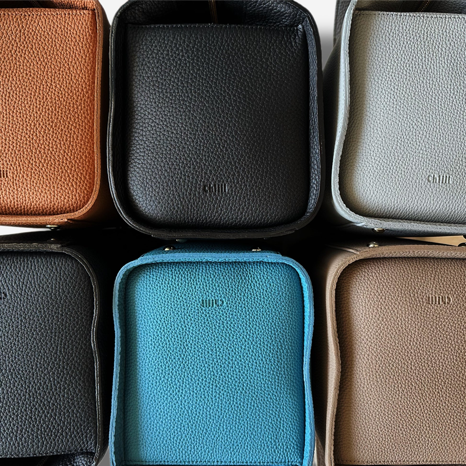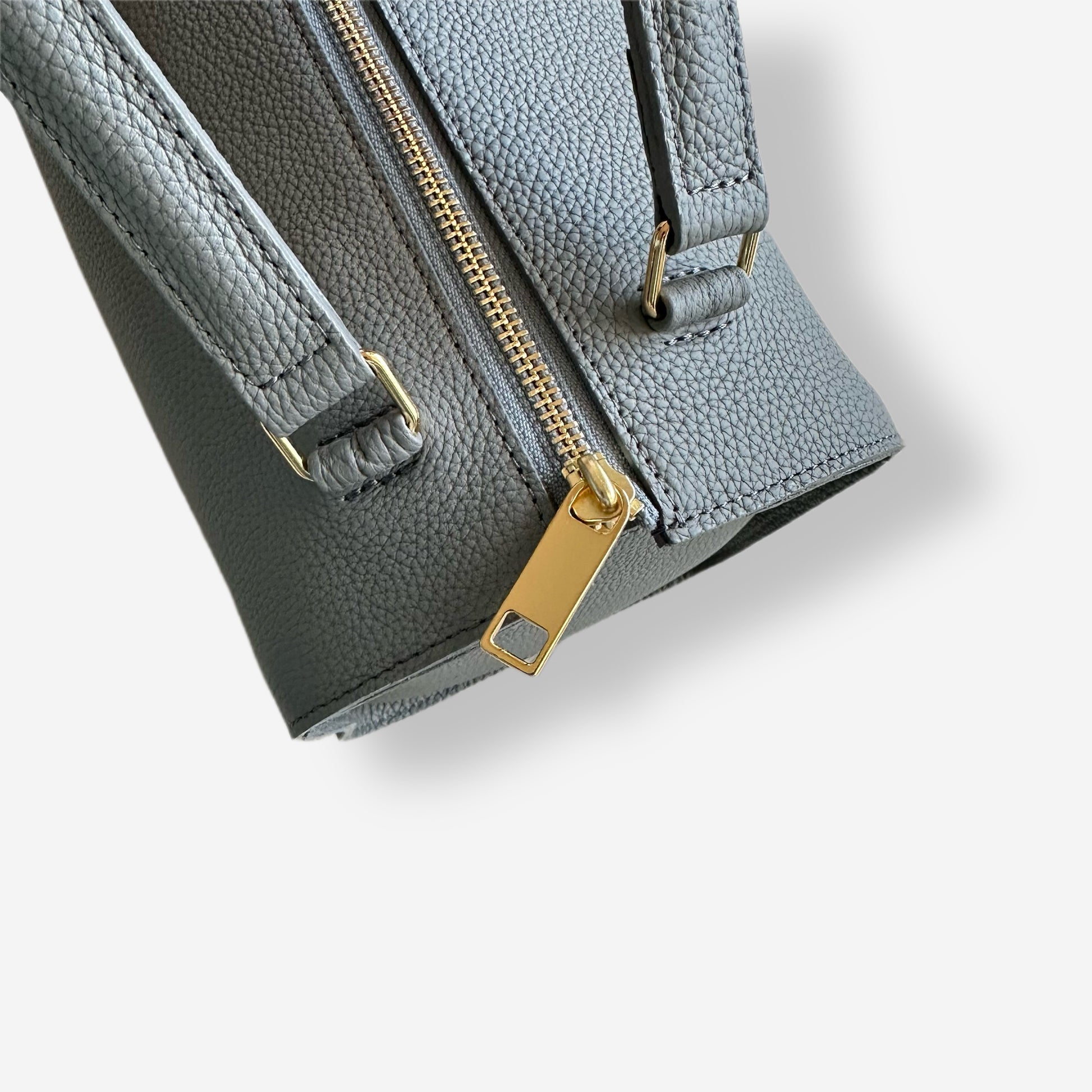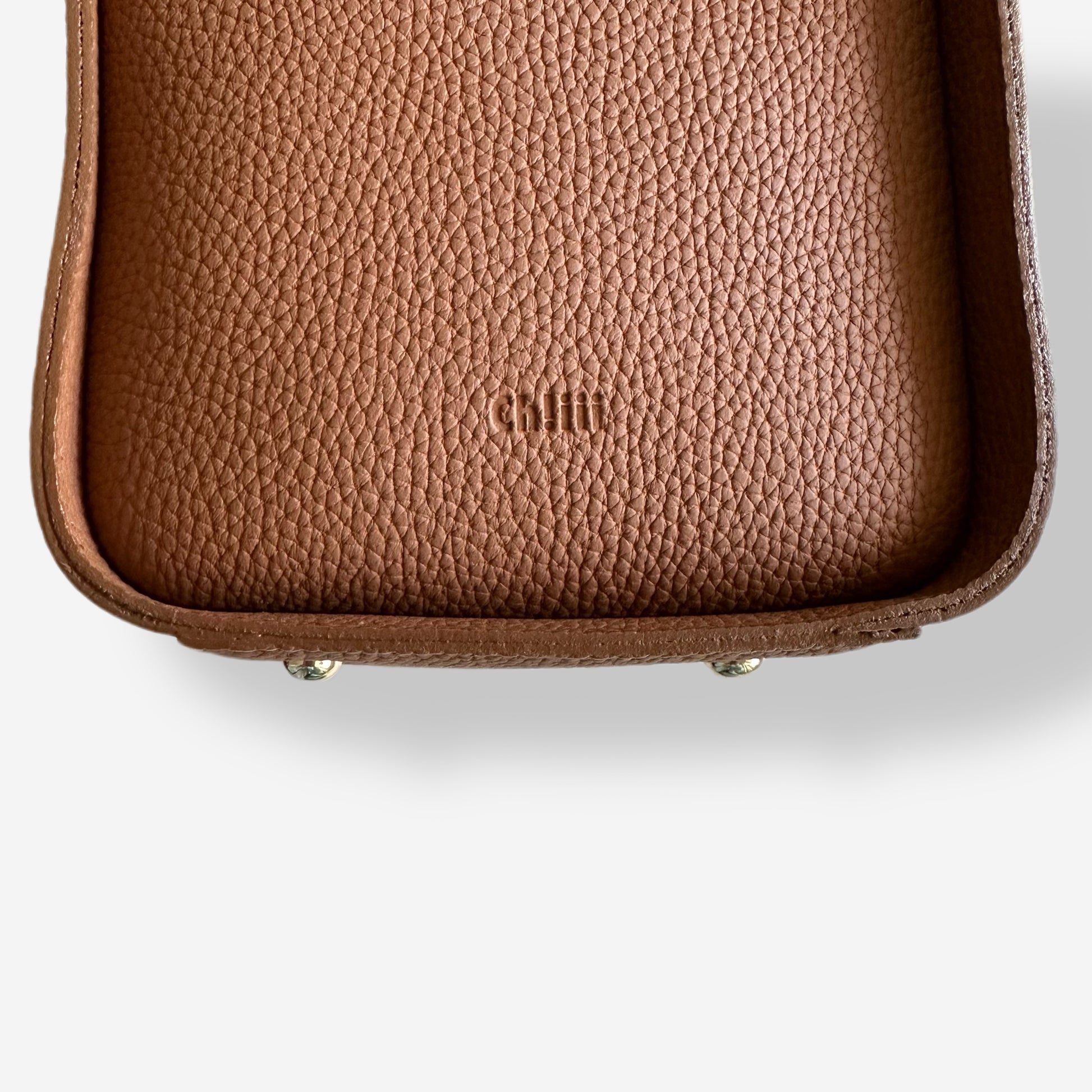 直線的なスクエア型の小さめなフォルム、余計なものを削ぎ落としたデザインでありながら広いマチは収納力もしっかりございます。いつも持ち歩くものが気持ちよく収まるサイズ。