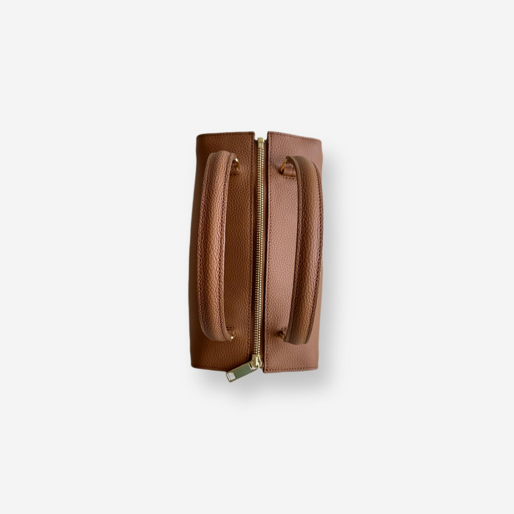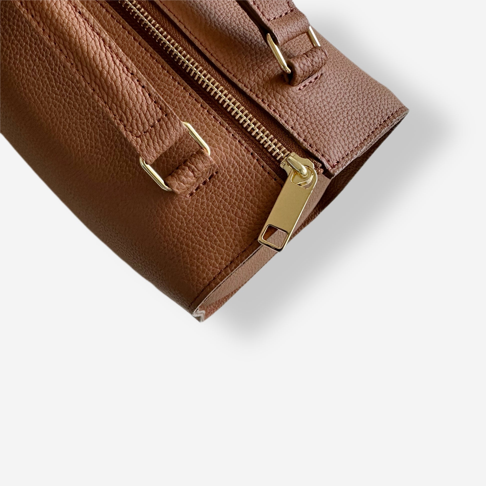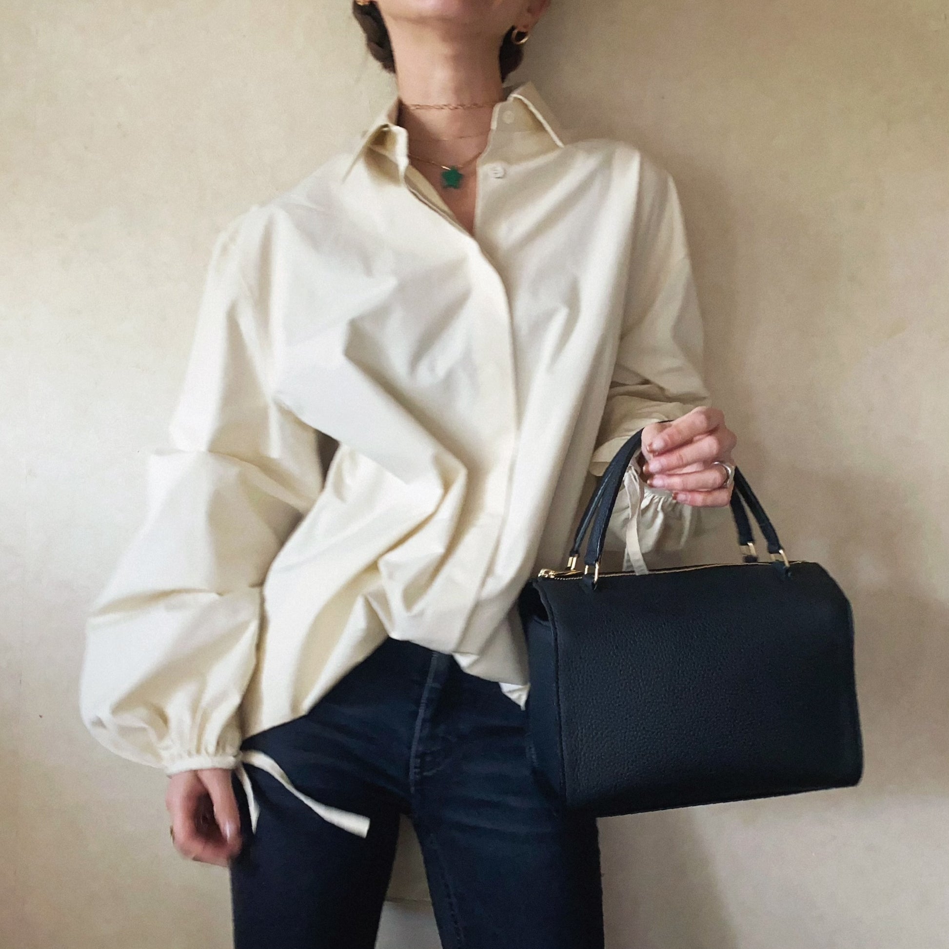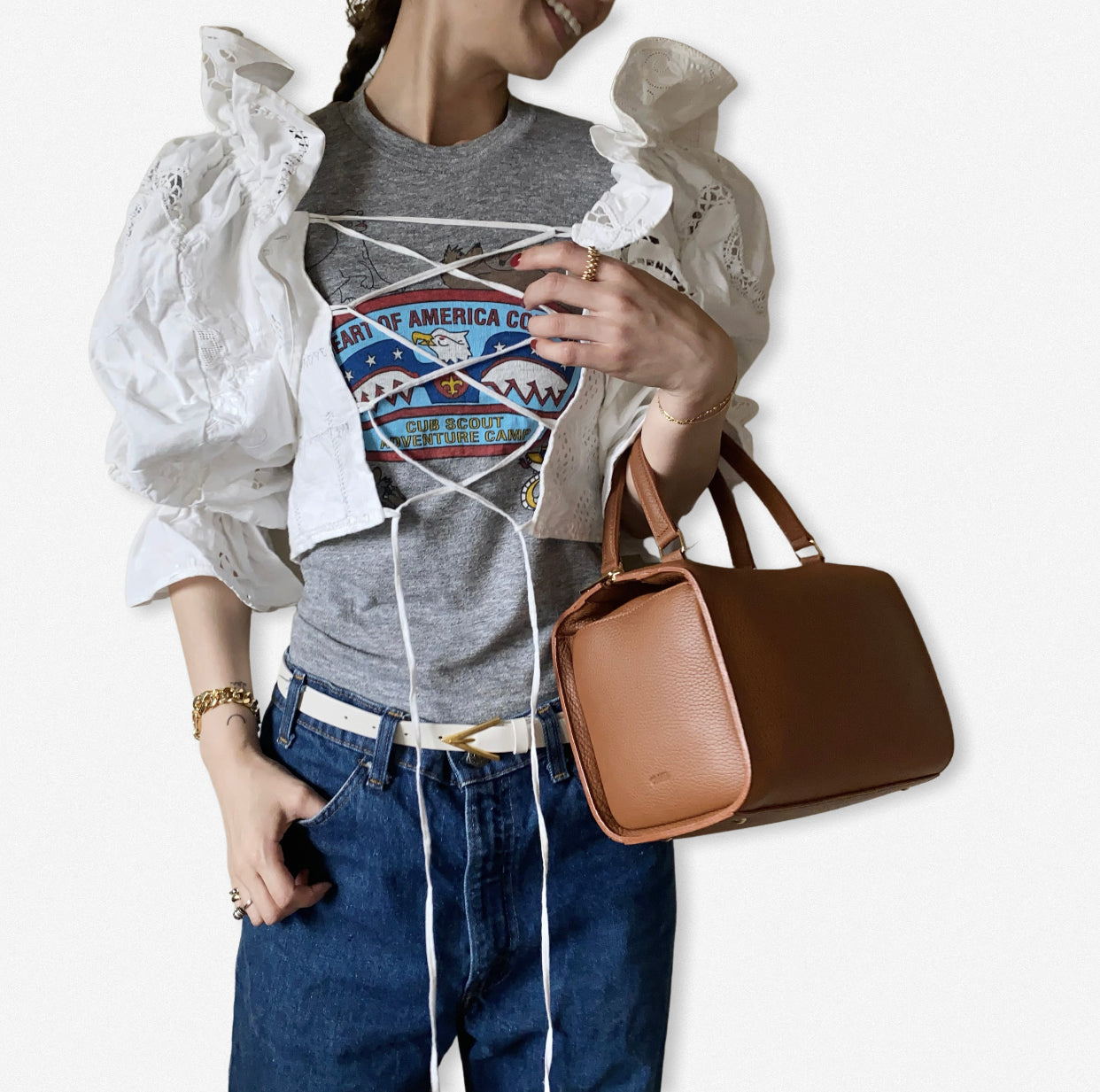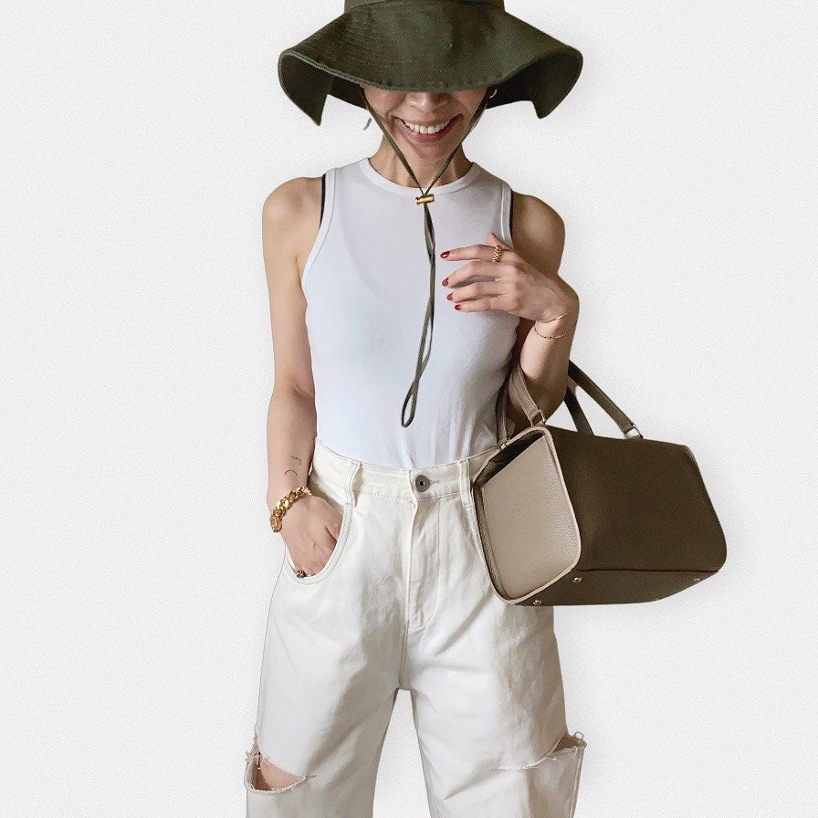 直線的なスクエア型の小さめなフォルム、余計なものを削ぎ落としたデザインでありながら広いマチは収納力もしっかりございます。いつも持ち歩くものが気持ちよく収まるサイズ。