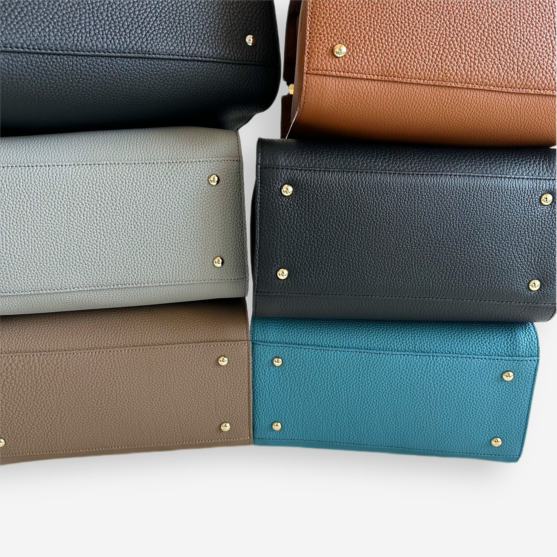 洗練された雰囲気のカラーたちはお洋服に馴染みやすく、お仕事やきれい目なファッションの時はもちろん、美しくシボの出たレザーにゴールド金具はいつものファッションを格上げしてくれます。