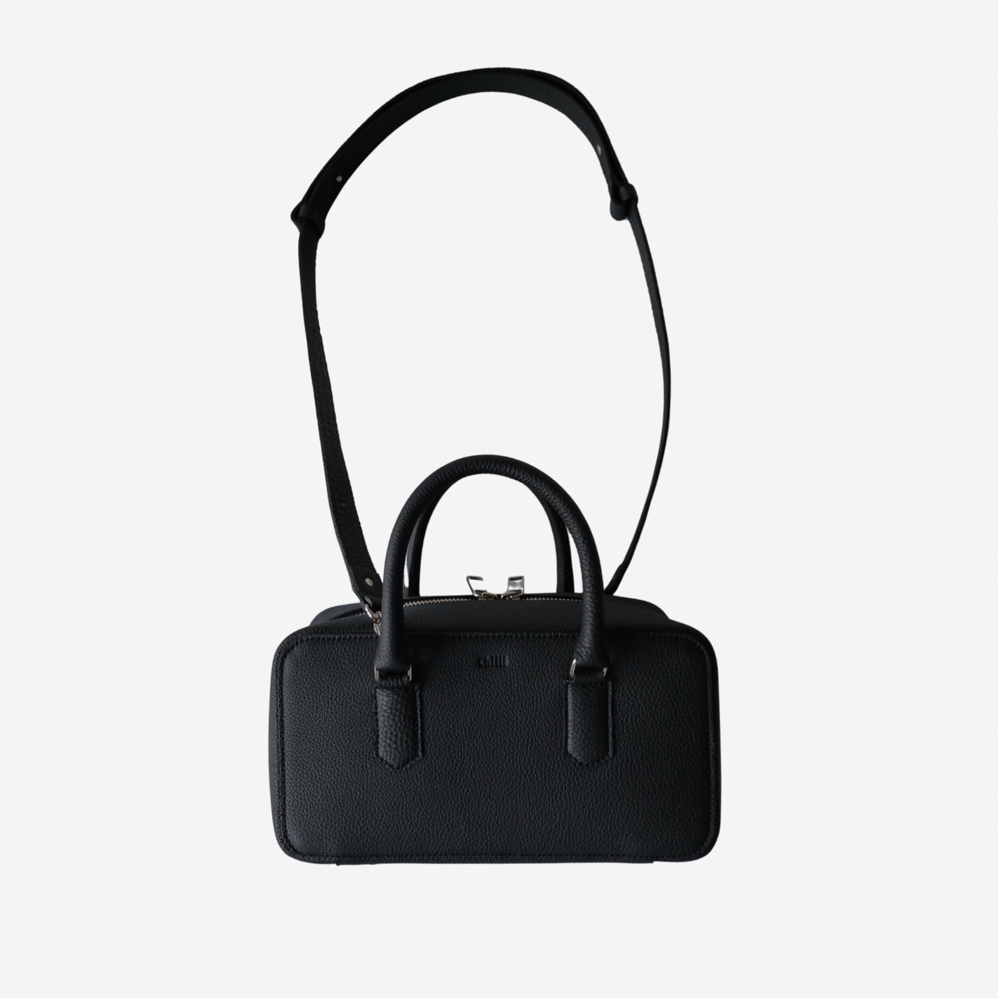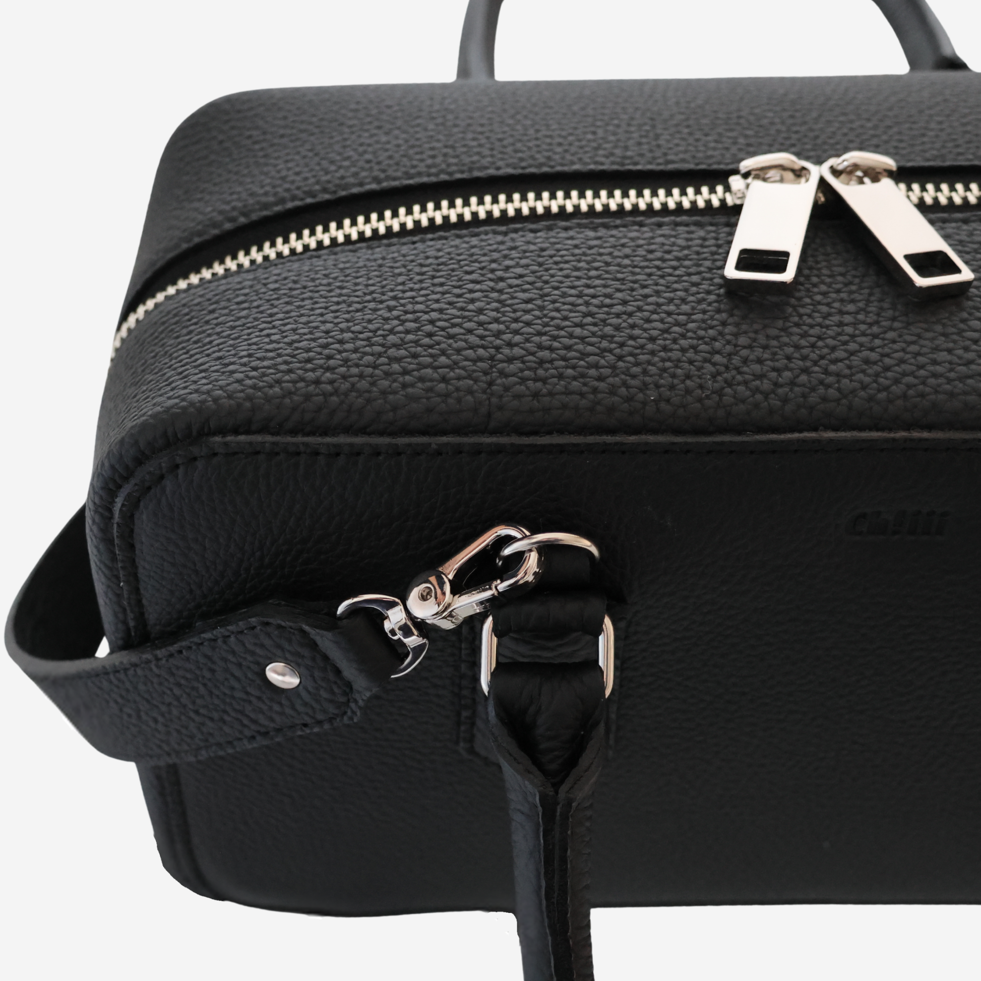 金具にギボシ留めのごくシンプルなスライド式のショルダー、接続部分(Dカン)は本体ハンドルの 裏に隠し、可能な限りシンプルに、