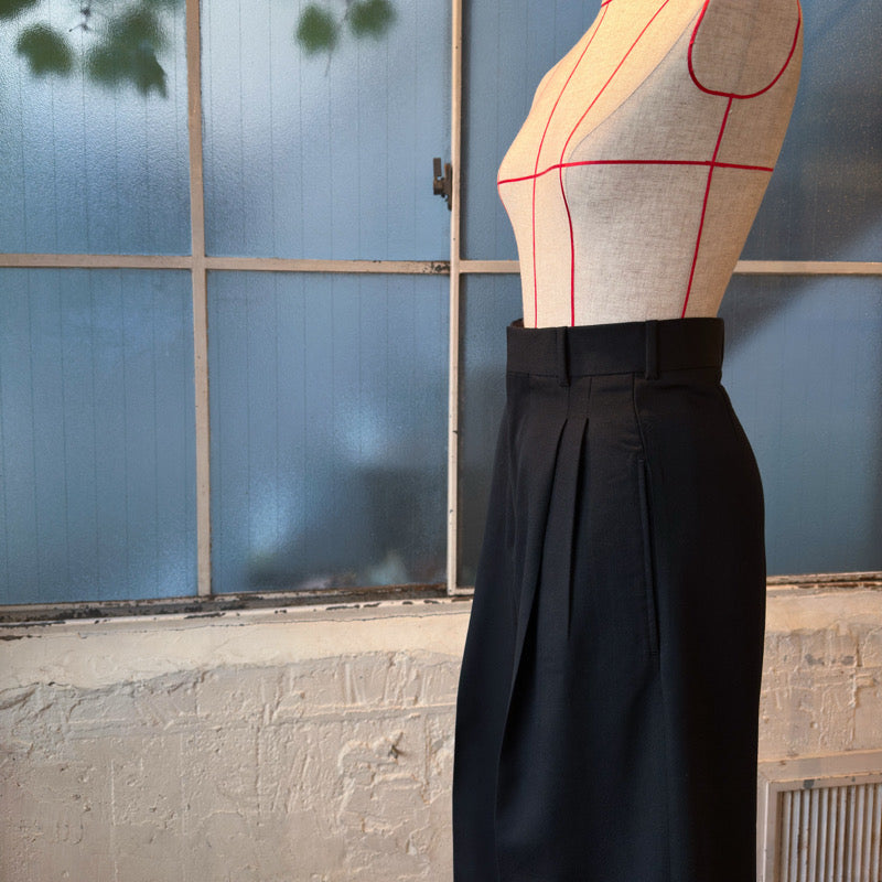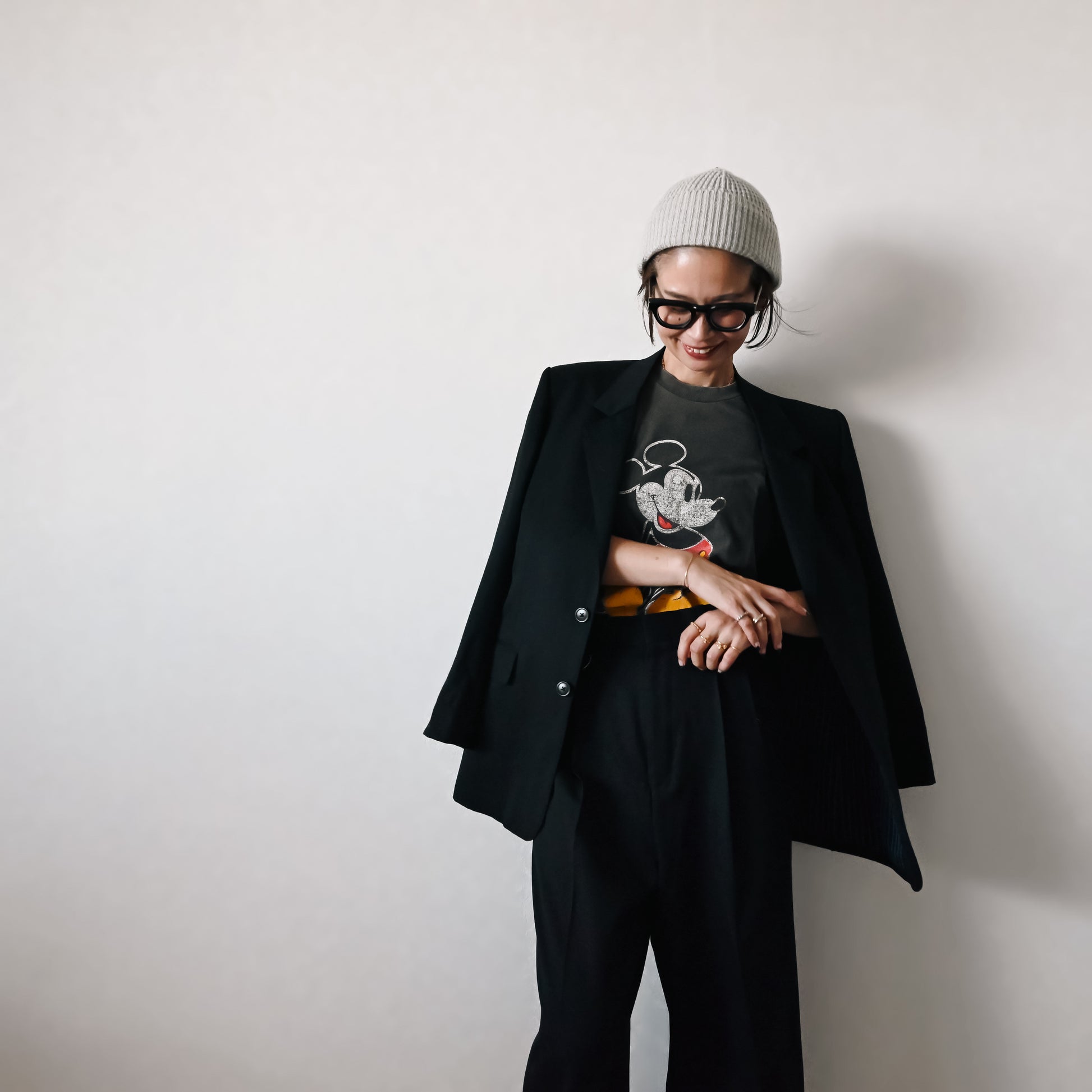 大きなタックと小さなタックを組み合わせたツータックパンツ。大きなタックが縦のラインに立体感をプラスし、小さなタックが横のバランスを整えてくれます。幅広のシルエットでも、タックのおかげでウエスト周りはすっきり、モードな雰囲気。