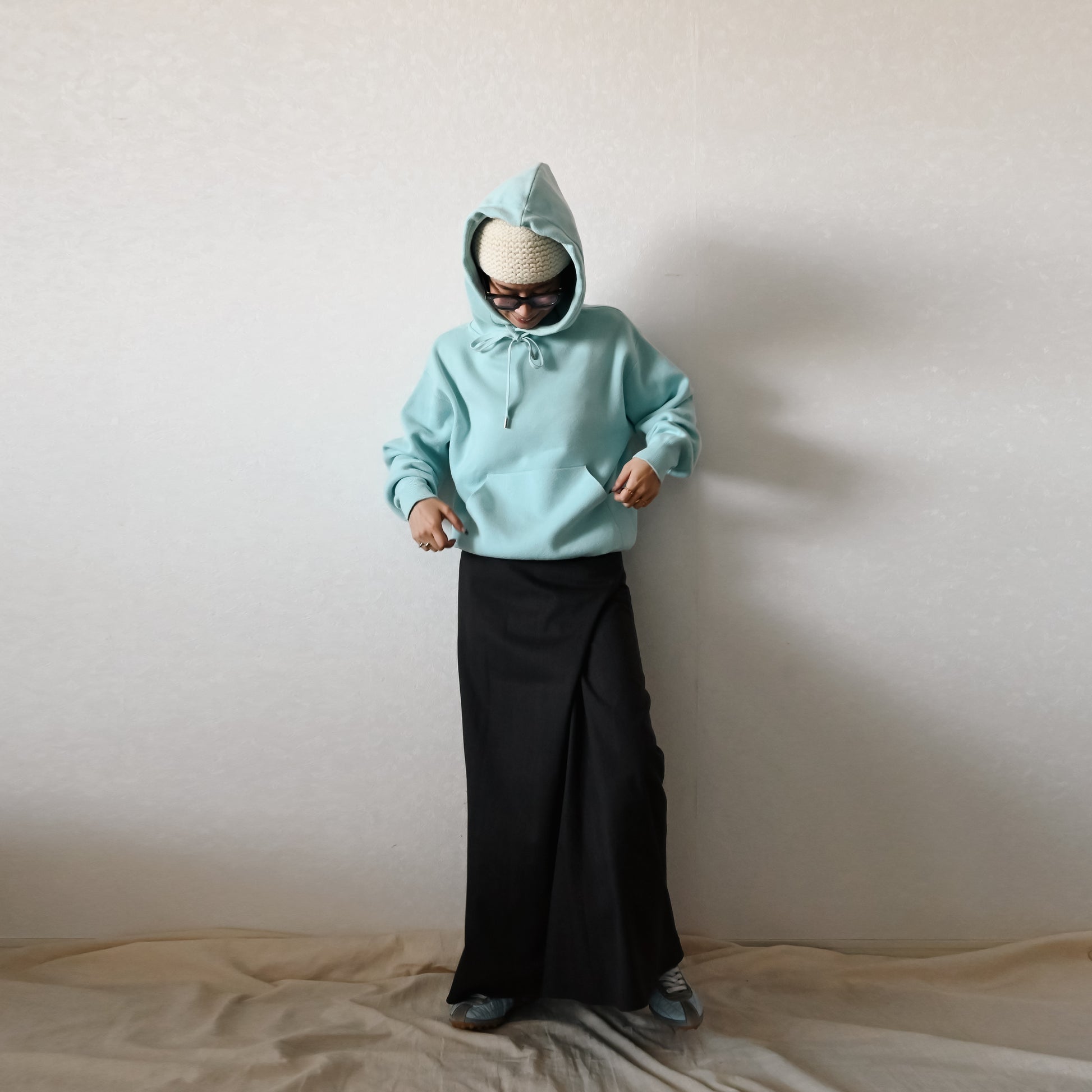 腰まわりはすっきり、しっかりとした丈感のある理想的なマキシスカート。